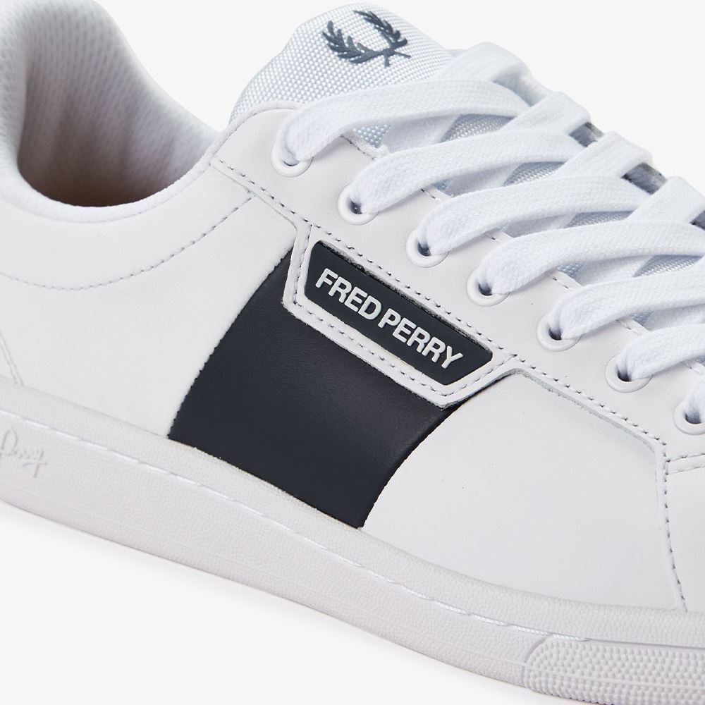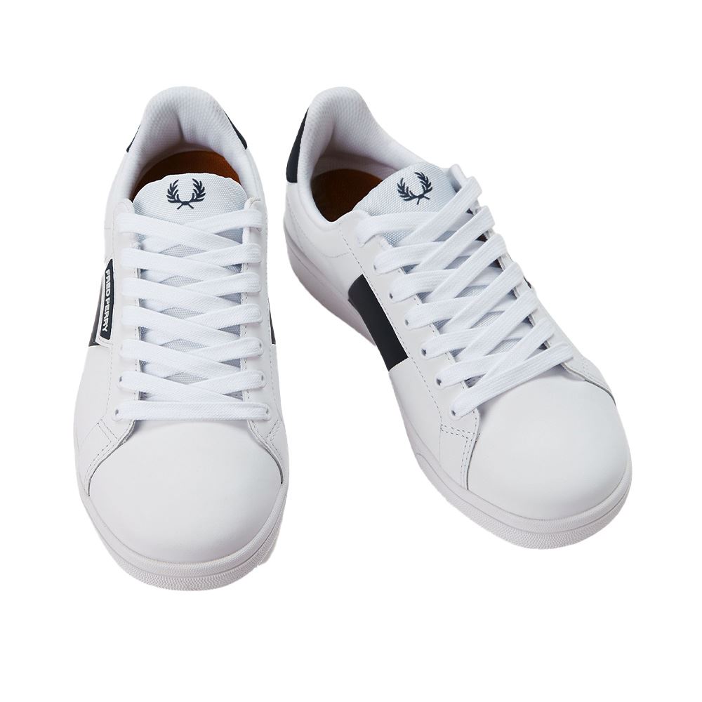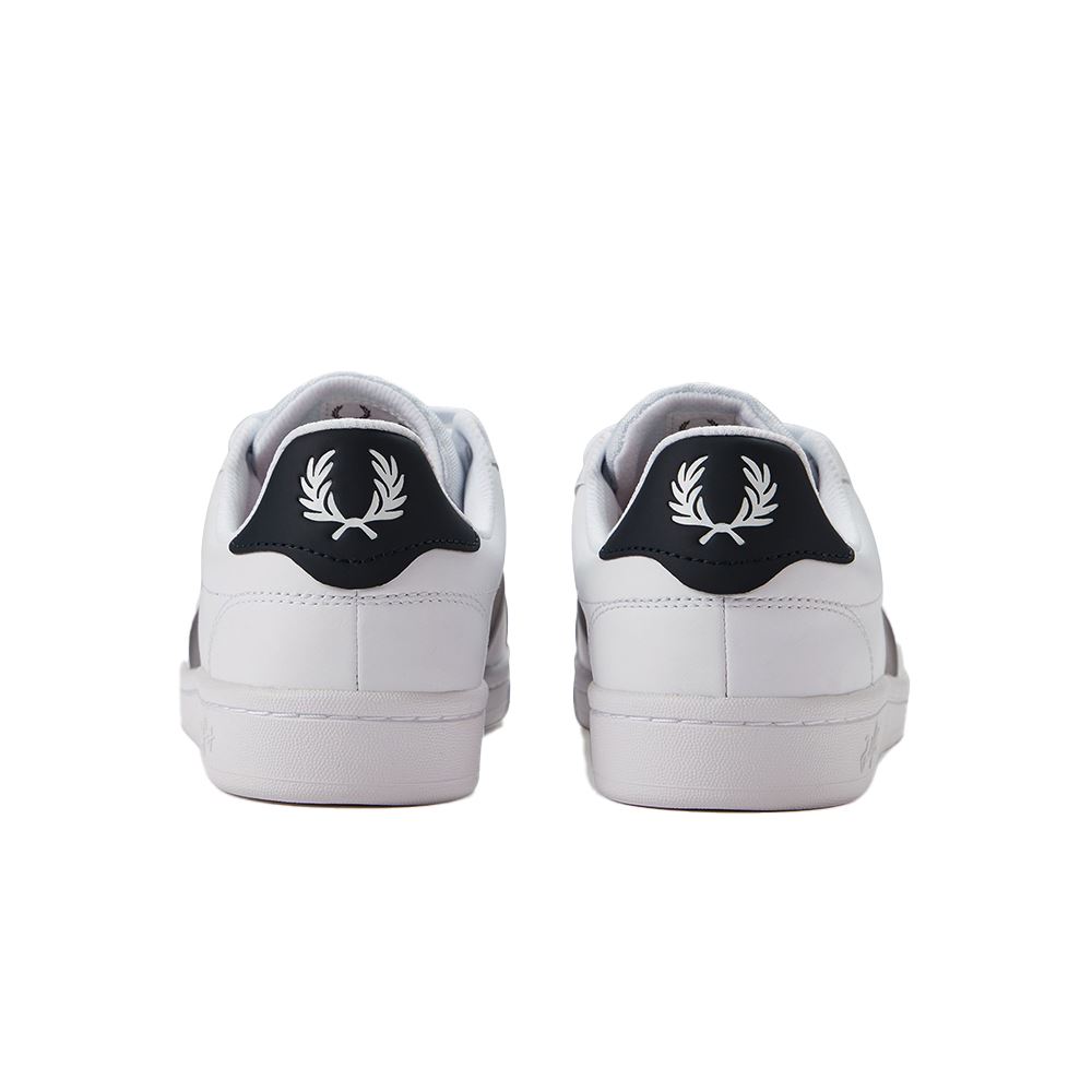 Fred Perry B1310 Branded-modellen – en ren tennissko i lyxig design. Skon har mjukt läder med perforerade detaljer, broderad Laurel Wreath-logga på sidan och minimalistiska accenter vid häl och plös. Den kombinerar sportig arv med elegant streetwear-känsla.