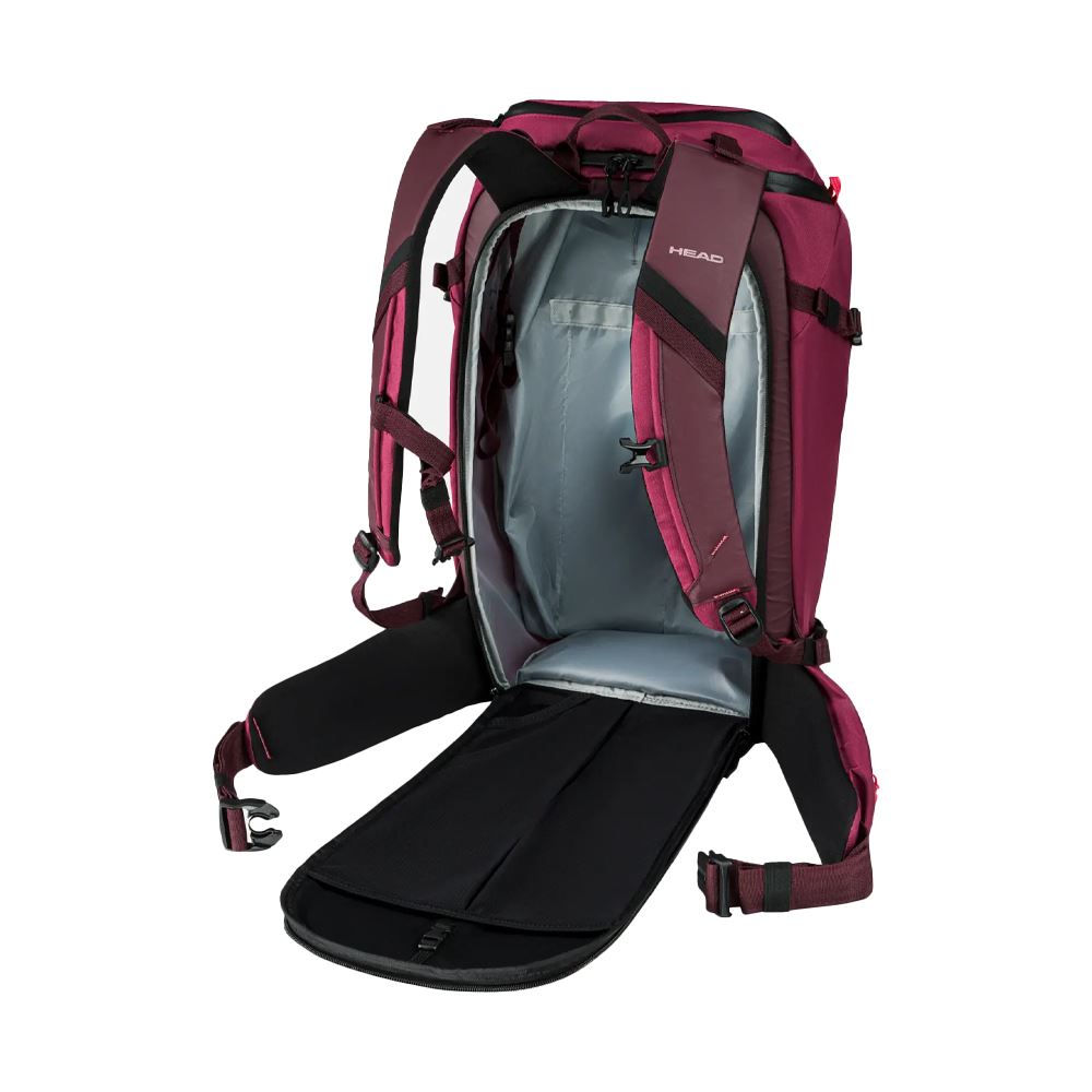 Backpack Rymmer 25 liter och har fack för lavinutrustning, vätskesystem och värdesaker. Hjälmen fästs externt, skidor kan bäras diagonalt eller i A-ram, och vadderade, justerbara remmar ger bekväm passform vid toppturer.