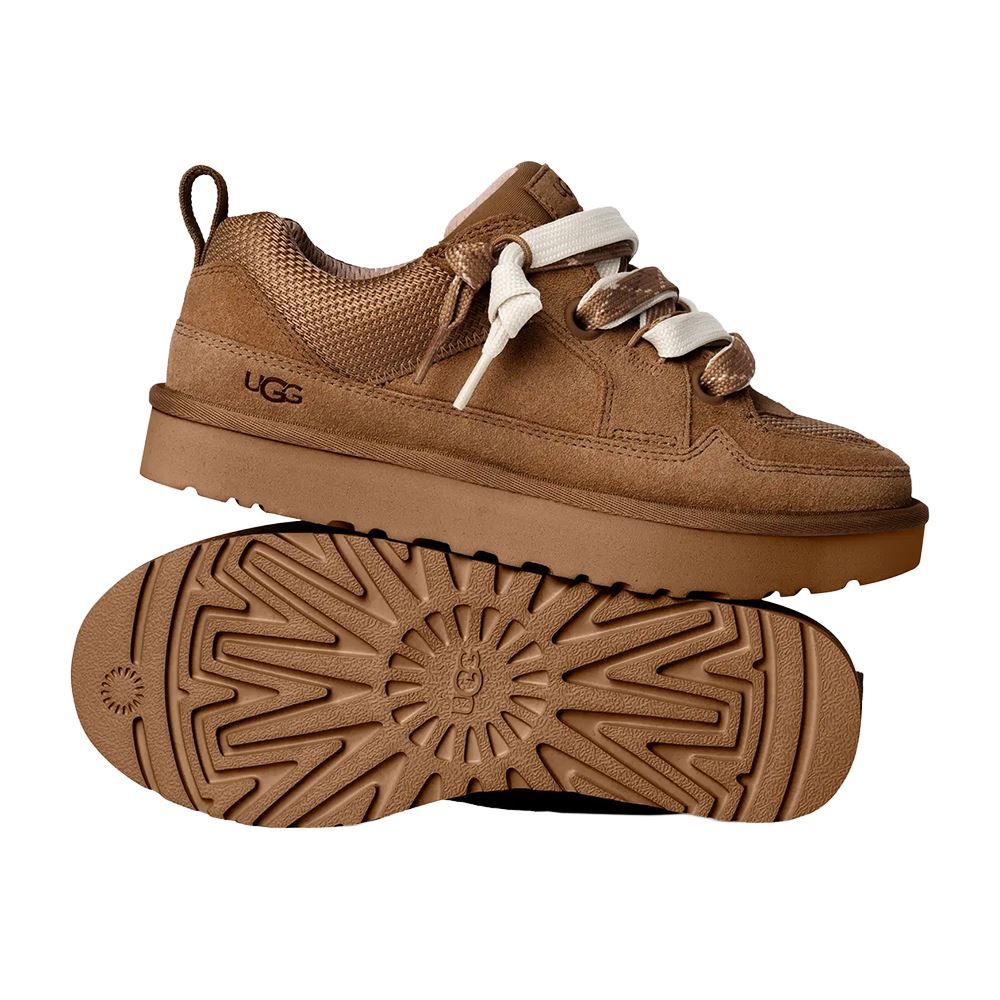 UGG Lo Lowmel är ett par sneakers med lågt kaft, en ovandel i mocka och textil, överdimensionerad vadderad plös med grov snörning samt en EVA yttersula för högsta komfort.
