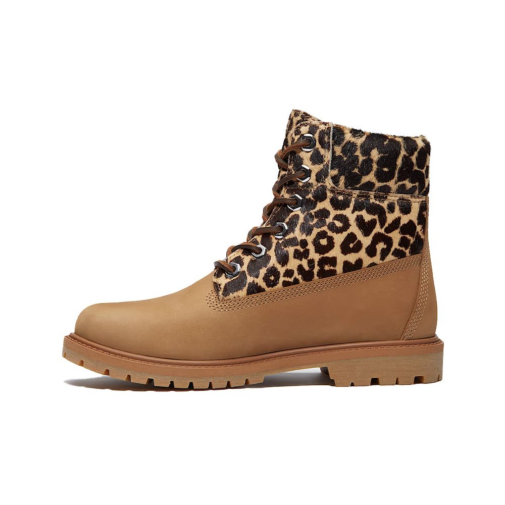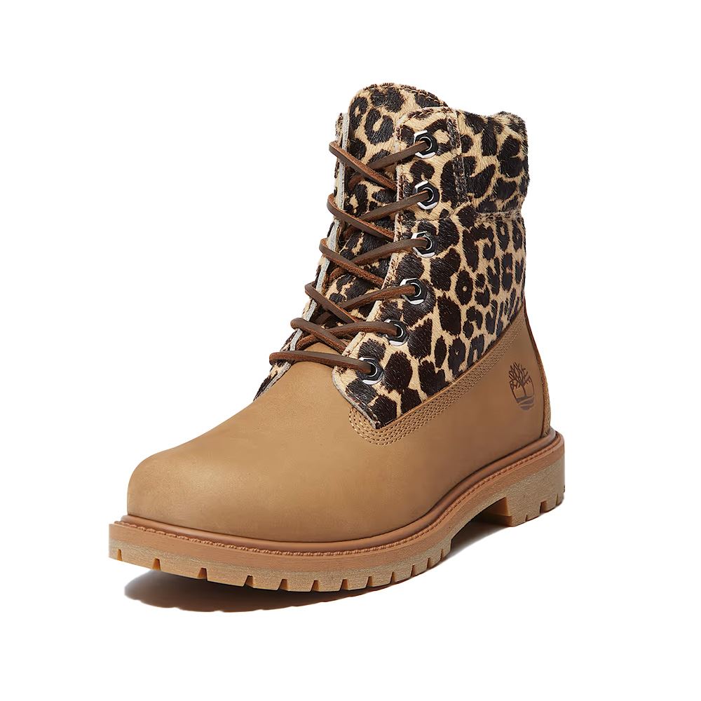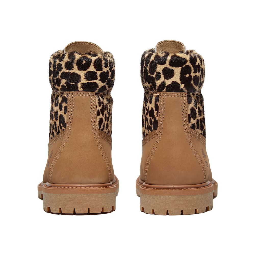 Den här unika versionen av Timberlands ikoniska känga kombinerar exklusivt nubuckläder med leopardmönstrad "pony hair"-finish – tillverkad av koskinn som rakats för att framhäva en mjuk, lyxig struktur.